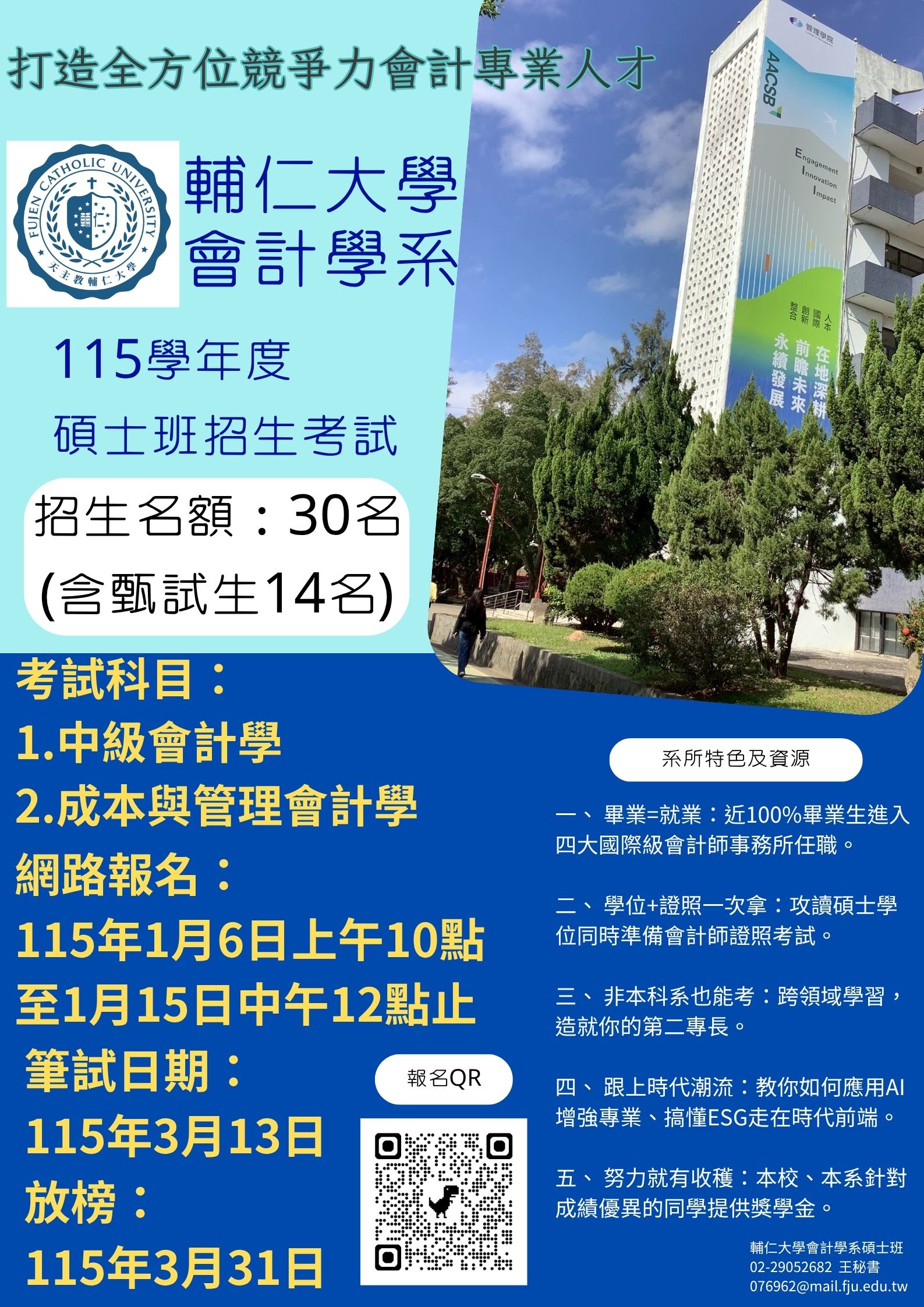 為鼓勵本系(含雙主修)學士班優秀學生繼續於本系修讀碩士班課程,以期連貫學習及縮短修業年限,特依本校《學士班優秀學生選修碩士班課程辦法》訂定「輔仁大學會計學系學士班優秀學生選修碩士班課程申請辦法」。