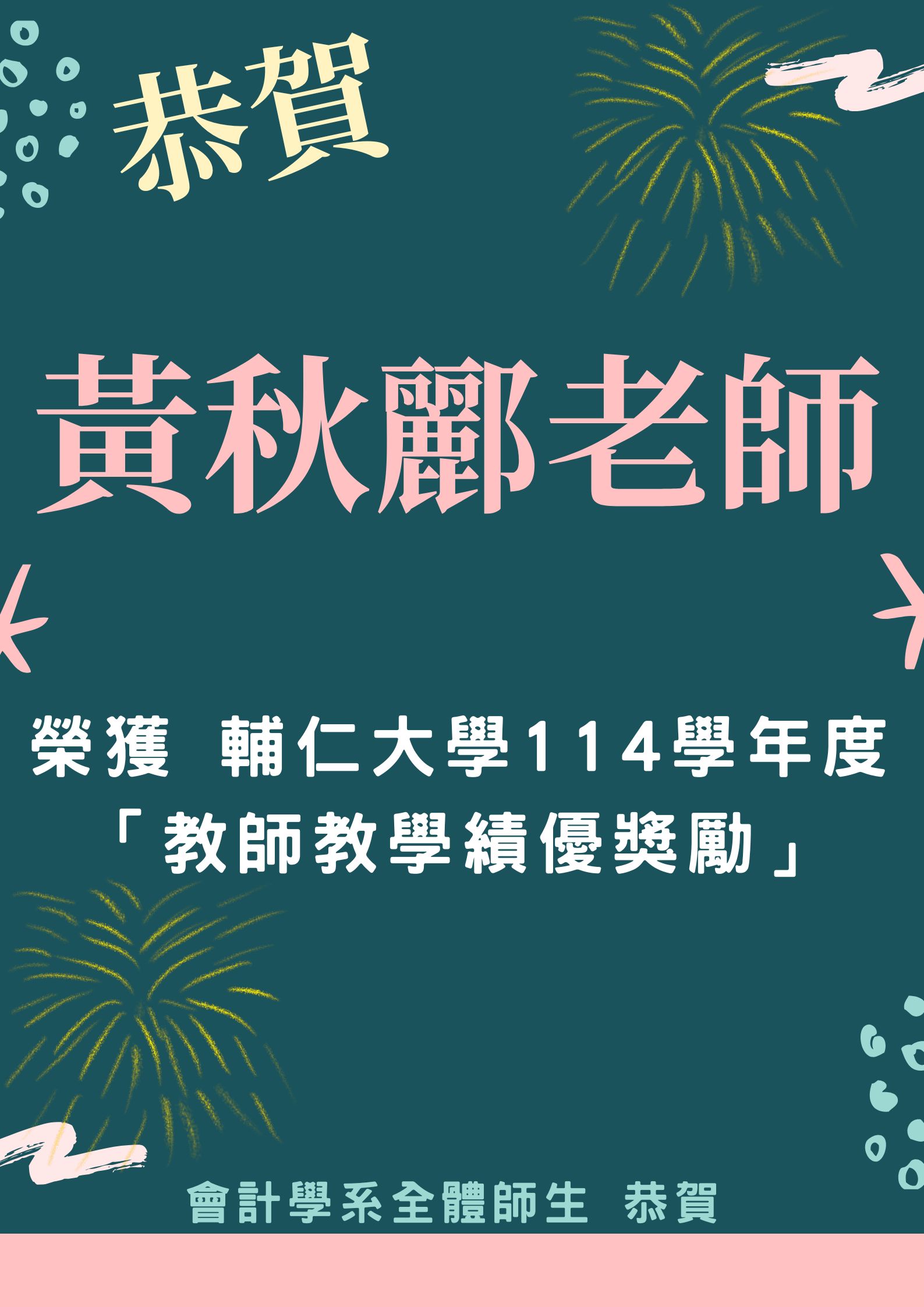 [恭賀] 黃秋酈老師~榮獲輔仁大學114學年度教師教學績優獎勵