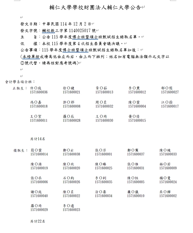 [碩士班] 115學年度碩士班甄試錄取名單公告