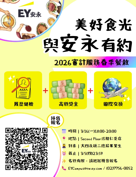 【EY】2026安永聯合會計師事務所 審計服務春季餐敘開放報名(報名至2026/3/5(四)23:59)